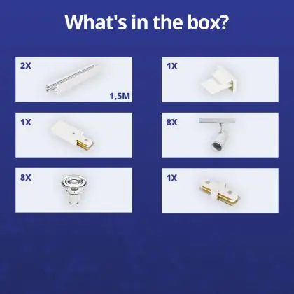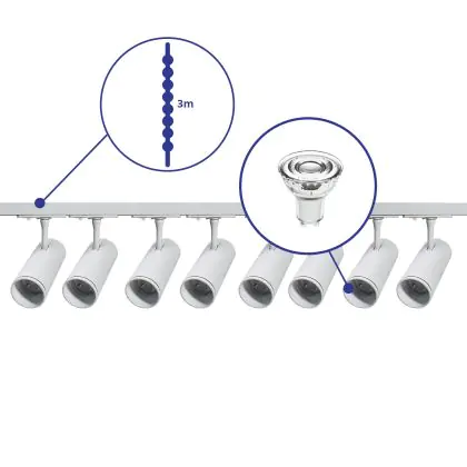 Beschreibung Komplettset 1-Phasen Rail 3 Meter Weiß | incl. 8x Spot + GU10 2700K 3W Dimmbar + Abschlusskappe, Stromanschluss und I-Verbinder