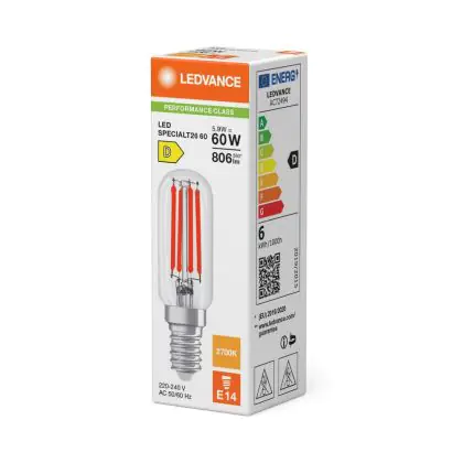 Die Ledvance LED Spezial E14 Fadenlampe Klar 5.9W 806lm - 827 Extra Warmweiß | Ersatz Für 60W ist eine effiziente E14 LED-Lampe mit Retrodesign und der perfekte Ersatz für Ihre konventionellen 60W Lampen mit E14. Zudem strahlt sie Licht in der Farbtemperatur aus und punktet durch eine lange Lebensdauer.