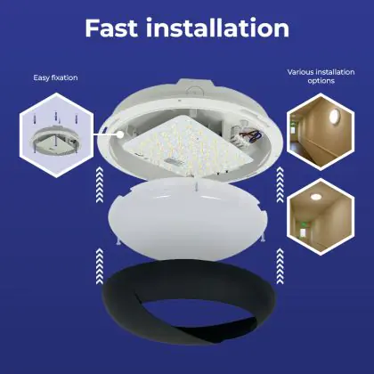 Die Noxion LED-Wand- und Deckenleuchte Pro V2 Weiß 12/16/20W 2400lm - 830-840-865 CCT | 325mm - IP65 - Bewegungs- und Lichtsensor + Augenlid Ring Schwarz ist eine Feuchtraumleuchte. Sie strahlt Licht in der Farbtemperatur aus und punktet durch eine lange Lebensdauer. Diese Leuchte ist speziell zur Verwendung in Feuchträumen (Keller, Waschräume, etc.) vorgesehen.