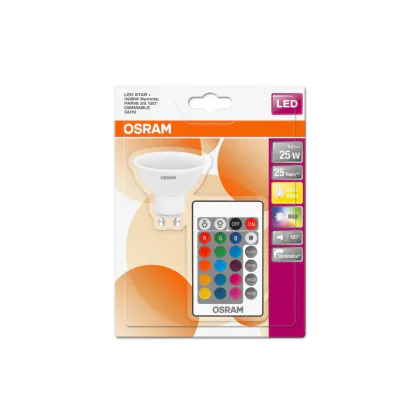 Die Lichtfarbe der LED Retrofit RGBW GU10 von Osram können Sie dank der RGBW-Technologie zu vielen verschiedenen Farbtönen wechseln – Je nachdem, wie Sie es gerade möchten. Dabei benötigen Sie weder eine App, noch müssen Sie die Lampe mit dem WLAN verbinden: Im Lieferumfang ist eine Fernbedienung enthalten, mit der Sie die Farbe ganz schnell und einfach anpassen können.