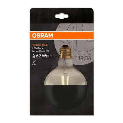 Die Osram Vintage 1906 LED E27 Globe 7W 827 Spiegel Schwarz | Ersetzt 52W ist eine moderne LED-Lampe mit Vintage-Design. Sie kann ganz einfach herkömmliche Leuchten mit einem E27-Sockel, sowie einem Verbrauch von 52 Watt ersetzen und ermöglicht damit eine Energieersparnis von bis zu 90 %. Zudem punktet die Lampe mit einer langen Lebensdauer, leuchtet in der Farbtemperatur extra Warmweiß und besitzt einen spiegelschwarzen Leuchtkörper, dessen untere Hälfte klar und die obere Hälfte schwarz ist.